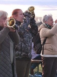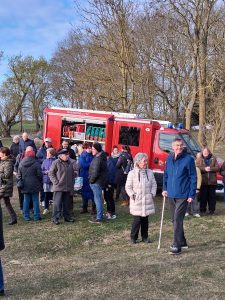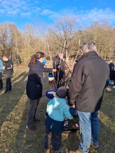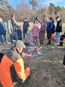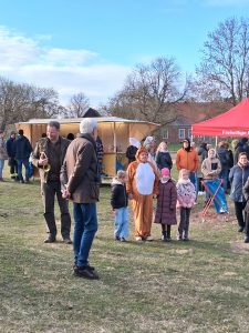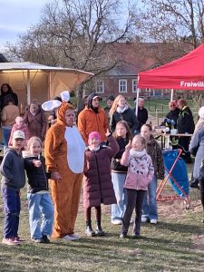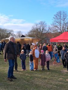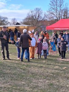 Auch in diesem Jahr fand das Osterfeuer am Herrenhaus in Koitendorf statt. Viele waren der Einladung gefolgt und hatten Freude, die Osterfeiertage mit einem zünftigen Osterfeuer zu beginnen. Alle wurden herzlich durch den Wehrführer Matthias Eisenblätter, den Bürgermeister Ulrich Blau und traditionell durch die Jagdhornbläser begrüßt. Auch der Osterhase, Verzeihung die Osterhäsin war gekommen. Sie scharte alle Kinder um sich herum und gemeinsam gingen sie auf Ostereiersuche. Dann konnten die Kinder, die kleinen aber auch die großen, bei Annegret Warning am kleinen Feuer Knüppelkuchen backen. Für das leibliche Wohl gab es Wildschwein mit Sauerkraut und leckere Bratwurst. Glühwein für die Großen und heißer Apfelsaft für die Kleinen wärmten von innen und es war ein fröhliches Miteinander. Ohne die vielen Vorbereitungen der Freiwilligen Feuerwehr und der vielen mithelfenden Hände wäre es jedoch nicht so ein schöner Start ins Osterfest geworden.