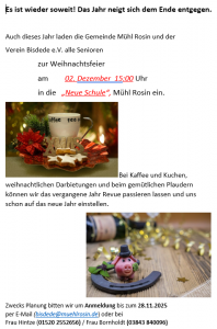 02.12.2025 Neue Schule: 15:00 Seniorenweihnachtsfeier Anmeldung bei: Frau Hintze: 0152 02552656 oder Frau Bornholdt: 03843 840096